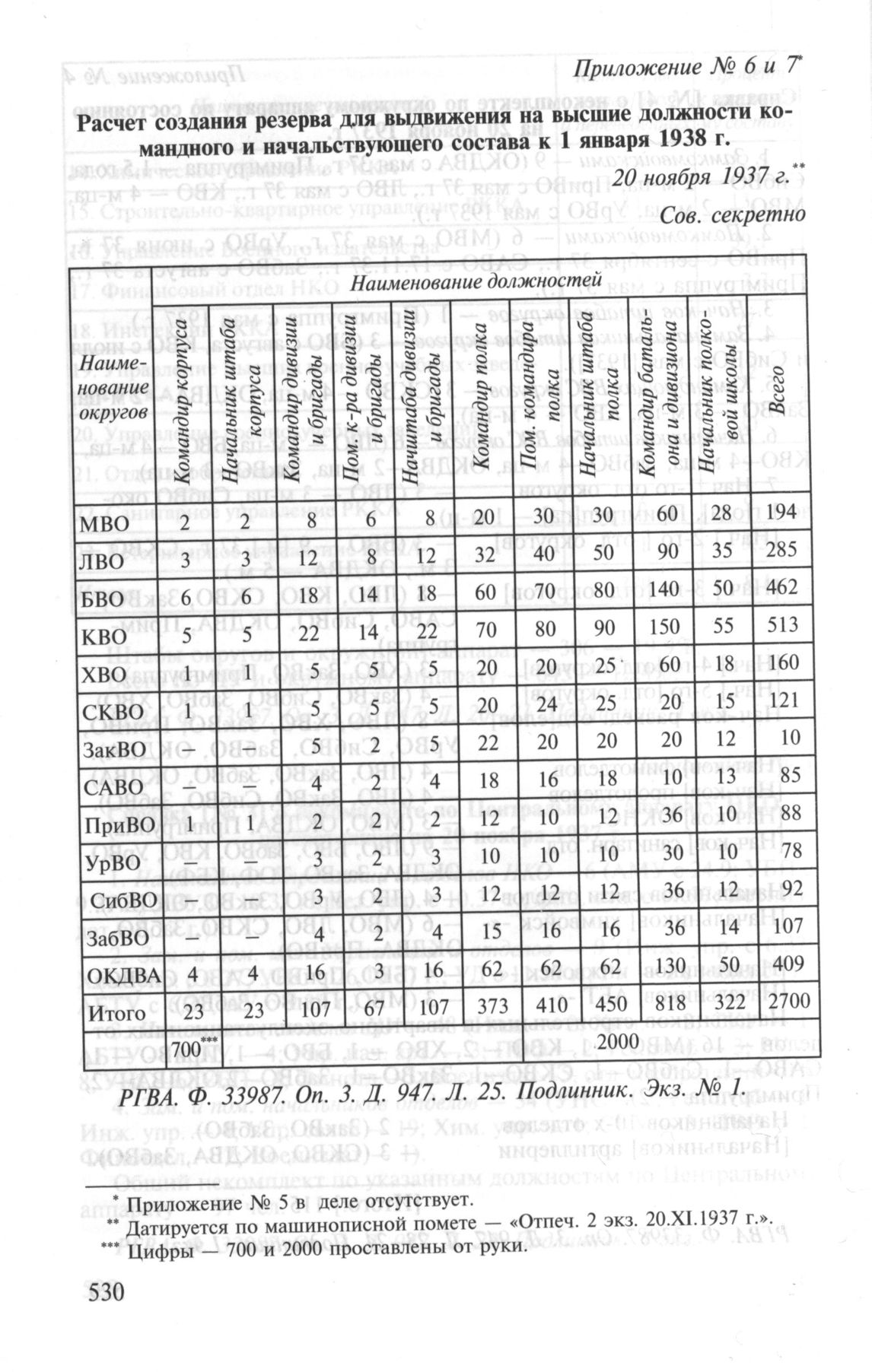 Расчет создания резерва для выдвижения на высшие должности командного и начальствующего состава к 1 января 1938 г. 20 ноября 1937 г. // РГВА. Ф. 33987. Он. 3. Д. 947. Л. 25. Подлинник. Экз. № 1.