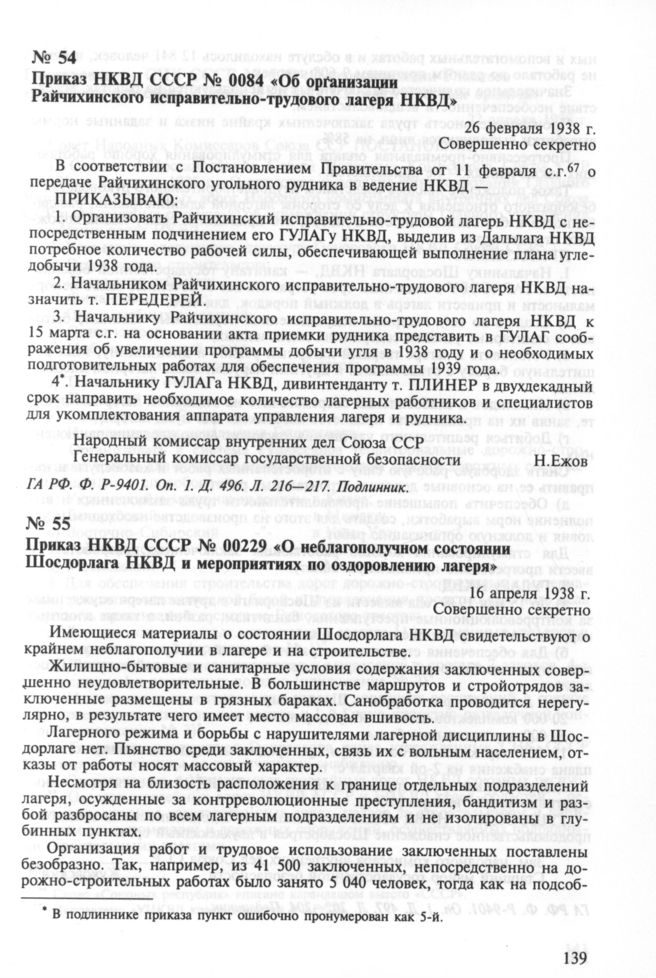 Приказ НКВД СССР № 00229 «О неблагополучном состоянии Шосдорлага НКВД и мероприятиях по оздоровлению лагеря». 16 апреля 1938 г. // ГА РФ. Ф. P-9401. Oп. 1. Д. 497. Л. 202-204. Подлинник.