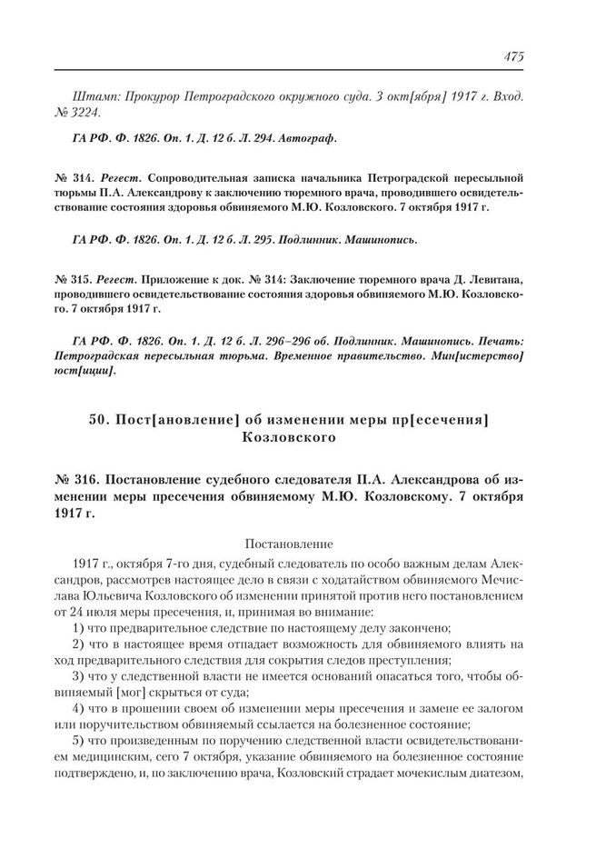 Регест. Приложение к док. № 314: Заключение тюремного врача Д. Левитана, проводившего освидетельствование состояния здоровья обвиняемого М.Ю. Козловского. 7 октября 1917 г. // ГА РФ. Ф. 1826. Оп. 1. Д. 12 б. Л. 296–296 об. Подлинник. Машинопись. Печать: Петроградская пересыльная тюрьма. Временное правительство. Министерство юстиции.