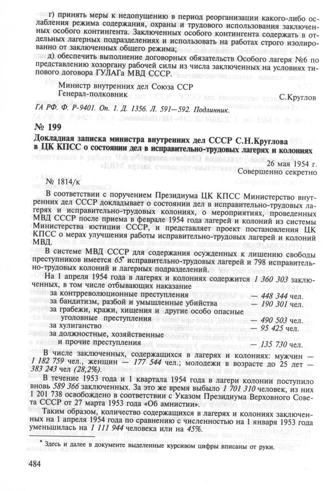 Докладная записка министра внутренних дел СССР С.Н.Круглова в ЦК КПСС о состоянии дел в исправительно-трудовых лагерях и колониях. 26 мая 1954 г. // ГА РФ. Ф. P-9414. Оп. 1. Д. 202. Л. 17-40. Копия.