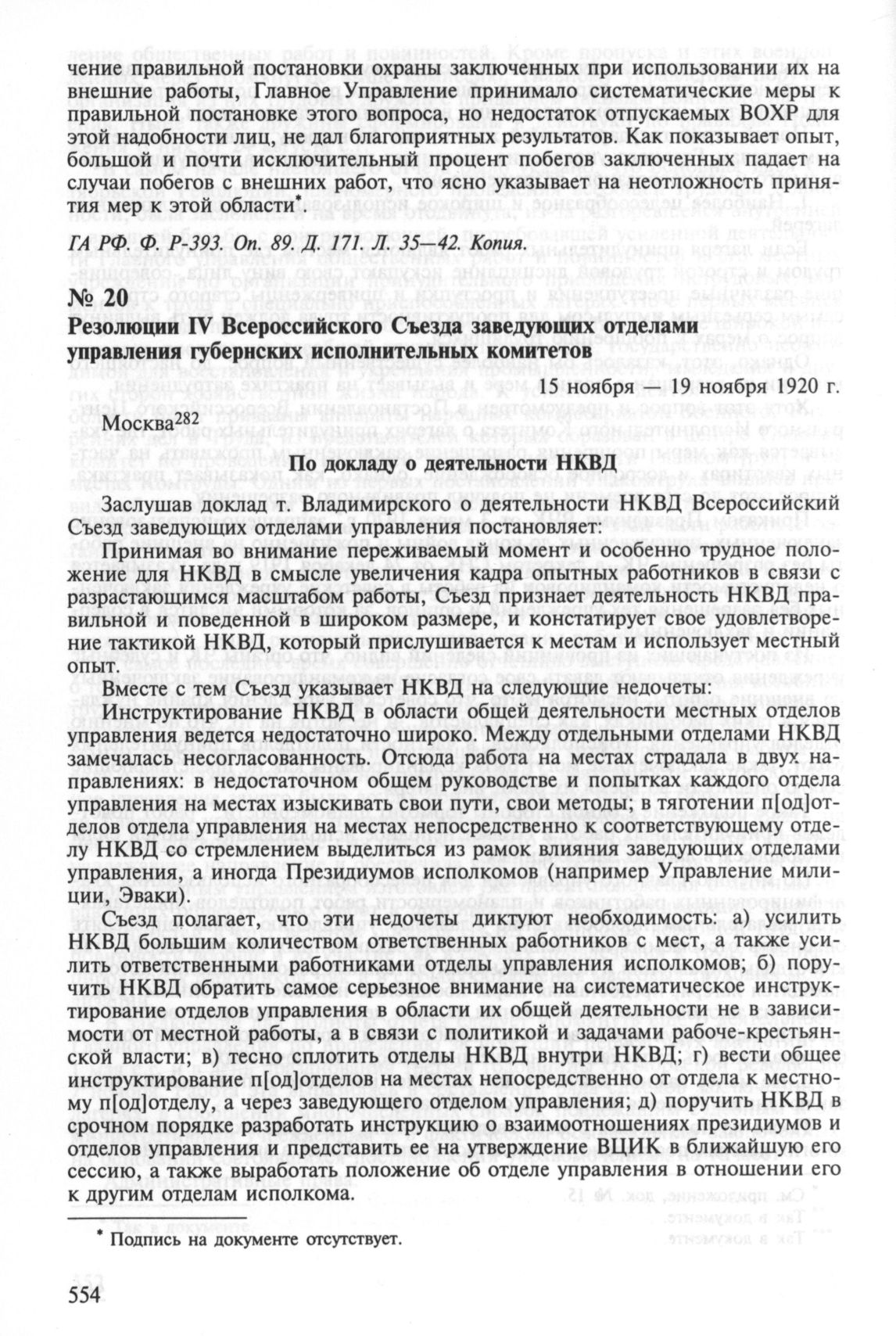 Резолюции IV Всероссийского Съезда заведующих отделами управления губернских исполнительных комитетов. 15 ноября — 19 ноября 1920 г. // ГА РФ. Ф. P-393. Оп. 89. Д. 171. Л. 253-27 об. Типографский экз.