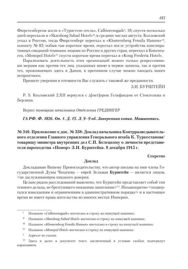 Приложение к док. № 338 : Доклад начальника контрразведывательного отделения Главного управления генерального штаба К. Туркестанова товарищу министра внутренних дел С.П. Белецкому о личности представителя пароходства «Помор» З.И. Бурштейна. 8 декабря 1915 г. : Секретно. Доклад // ГА РФ. Ф. 1826. Оп. 1. Д. 13. Л. 12. Подлинник. Машинопись. Бланк начальника Контрразведывательного отделения Главного управления Генерального штаба.