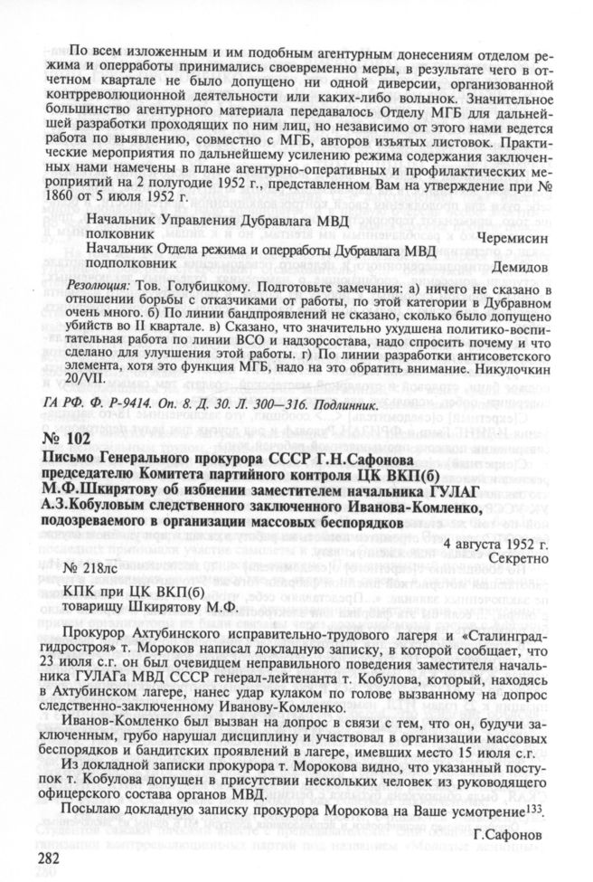 Письмо Генерального прокурора СССР Г. Н. Сафонова председателю Комитета партийного контроля ЦК ВКП(б) М. Ф. Шкирятову об избиении заместителем начальника ГУЛАГ А. З. Кобуловым следственного заключенного Иванова-Комленко, подозреваемого в организации массовых беспорядков. 4 августа 1952 г. // ГА РФ. Ф. P-8131. Оп. 32. Д. 795. Л. 108, 203-204. Заверенная копия.