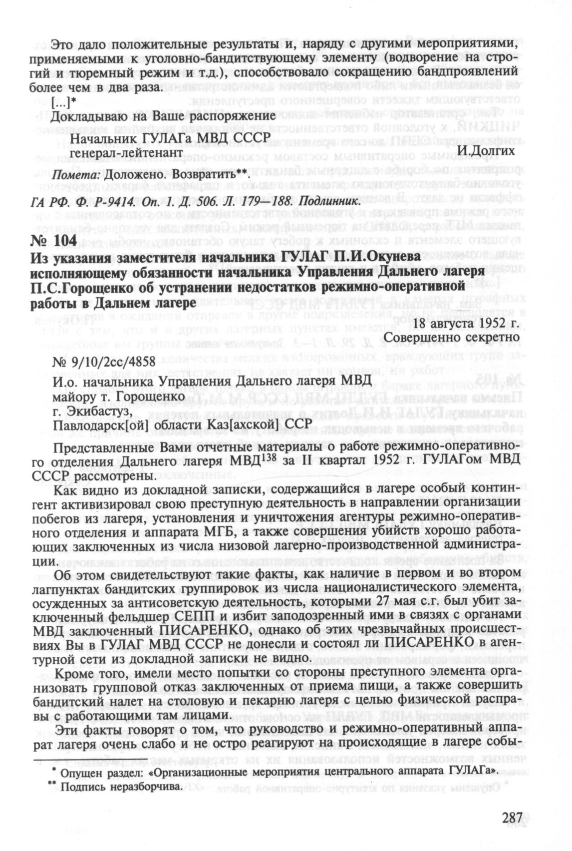 Из указания заместителя начальника ГУЛАГ П. И. Окунева исполняющего обязанности начальника Управления Дальнего лагеря П. С. Горощенко об устранении недостатков режимно-оперативной работы в Дальнем лагере. 18 августа 1952 г. // ГА РФ. Ф. P-9414. Оп. 8. Д. 29. Л. 1-3. Заверенная копия.