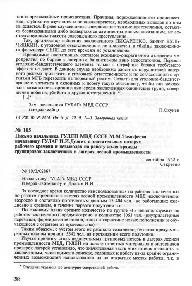 Письмо начальника ГУЛЛП МВД СССР М. М. Тимофеева начальнику ГУЛАГ И. И. Долгих о значительных потерях рабочего времени и невыводах на работу из-за вражды группировок заключенных в лагерях лесной промышленности. 1 сентября 1952 г.