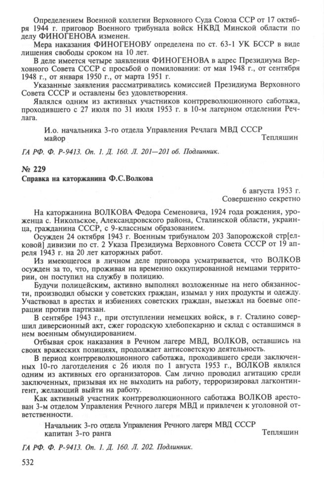 Справка на каторжанина Ф. С. Волкова. 6 августа 1953 г. // ГА РФ. Ф. P-9413. Оп. 1. Д. 160. Л. 202. Подлинник.