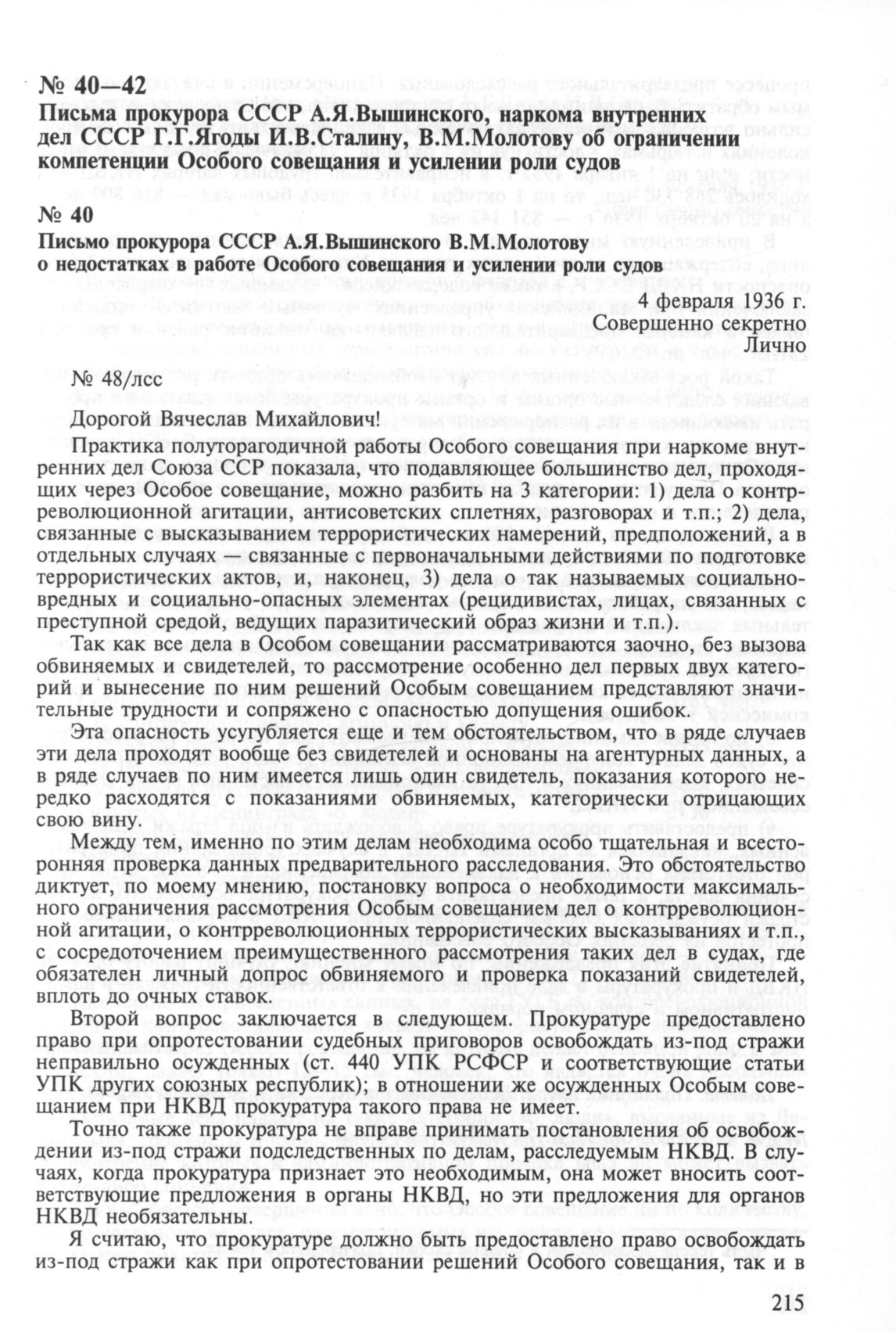 Письмо прокурора СССР А. Я. Вышинского В. М. Молотову о недостатках в работе Особого совещания и усилении роли судов. 4 февраля 1936 г. // ГА РФ. Ф. P-8131. Оп. 37. Д. 70. Л. 103—106. Копия.