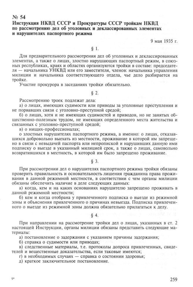 Инструкция НКВД СССР и Прокуратуры СССР тройкам НКВД по рассмотрению дел об уголовных и деклассированных элементах и нарушителях паспортного режима. 9 мая 1935 г.