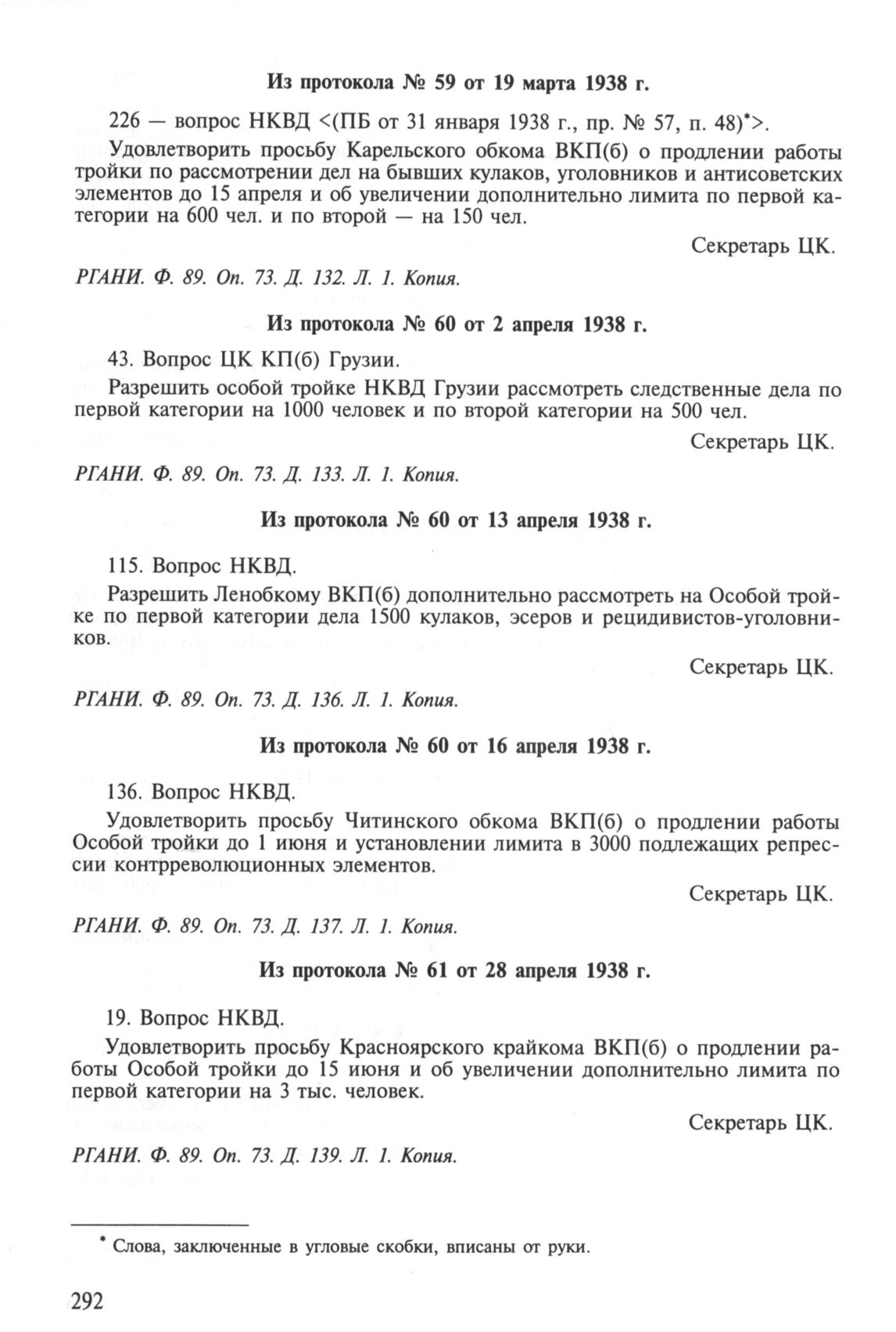 Выписки из протоколов заседаний Политбюро ВКП(б) по вопросам увеличения лимитов репрессированных по приказу НКВД СССР № 00447 «Об операции по репрессированию бывших кулаков, уголовников и других антисоветских элементов». 2 сентября 1937 — 29 августа 1938 г. Из протокола № 60 от 16 апреля 1938 г. // РГАНИ. Ф. 89. Оп. 73. Д. 137. Л. 1. Копия.