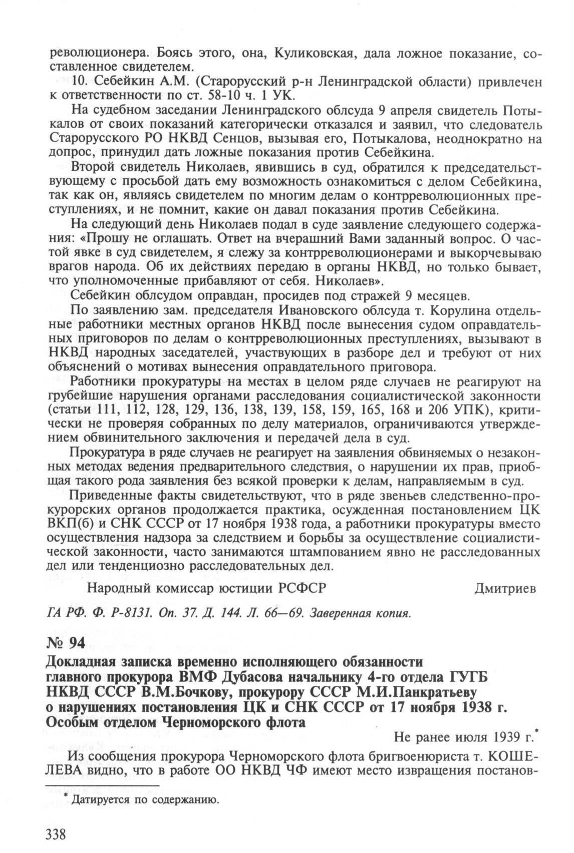 Докладная записка временно исполняющего обязанности главного прокурора ВМФ Дубасова начальнику 4-го отдела ГУГБ НКВД СССР В. М. Бочкову, прокурору СССР М. И. Панкратьеву о нарушениях постановления ЦК и СНК СССР от 17 ноября 1938 г. Особым отделом Черноморского флота. Не ранее июля 1939 г. // ГА РФ. Ф. P-8131. Оп. 37. Д. 148. Л. 1—4. Подлинник.