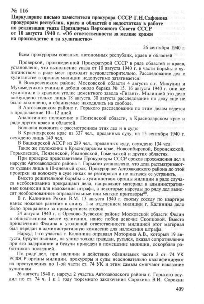 Циркулярное письмо заместителя прокурора СССР Г. Н. Сафонова прокурорам республик, краев и областей о недостатках в работе по реализации указа Президиума Верховного Совета СССР от 10 августа 1940 г. «Об ответственности за мелкие кражи на производстве и за хулиганство». 26 сентября 1940 г.