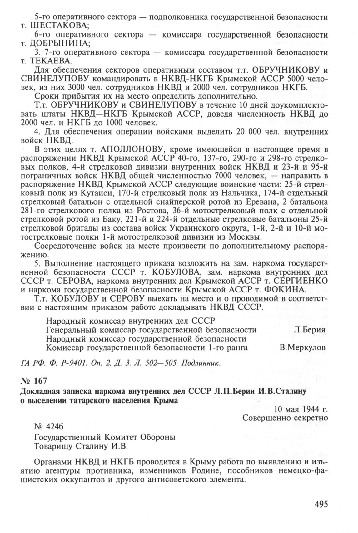 Докладная записка наркома внутренних дел СССР Л. П. Берии И. В. Сталину о выселении татарского населения Крыма. 10 мая 1944 г. // ГА РФ. Ф. P-9401. Oп. 2. Д. 65. Л. 41—43. Копия. Опубликовано частично: Бугай Н. Ф. Депортация народов Крыма. М., 2002. С. 85.