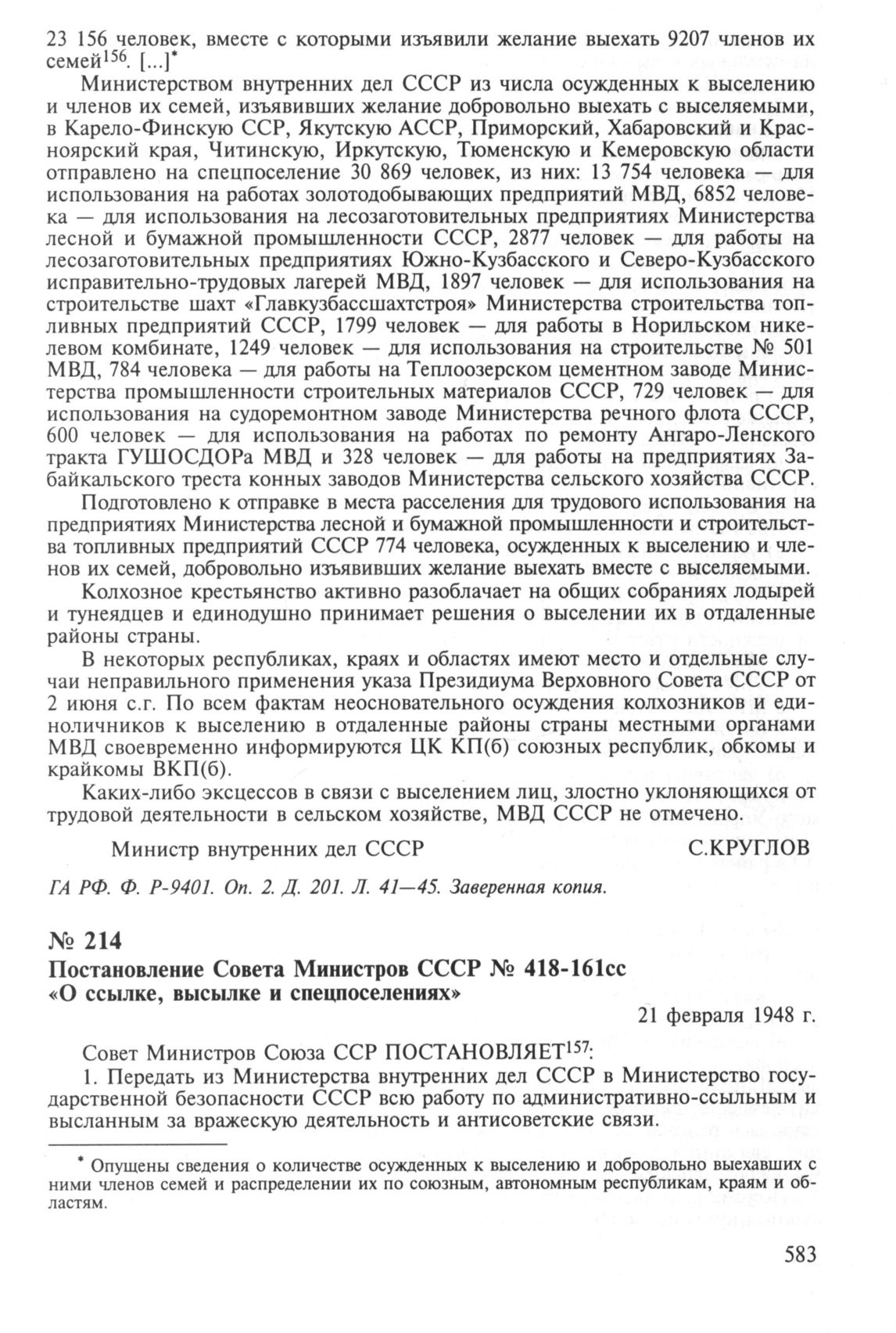 Постановление Совета Министров СССР № 418-161сс «О ссылке, высылке и спецпоселениях». 21 февраля 1948 г. // АП РФ. Ф. 93. Коллекция постановлений и распоряжений Совета Министров СССР за 1948 г.