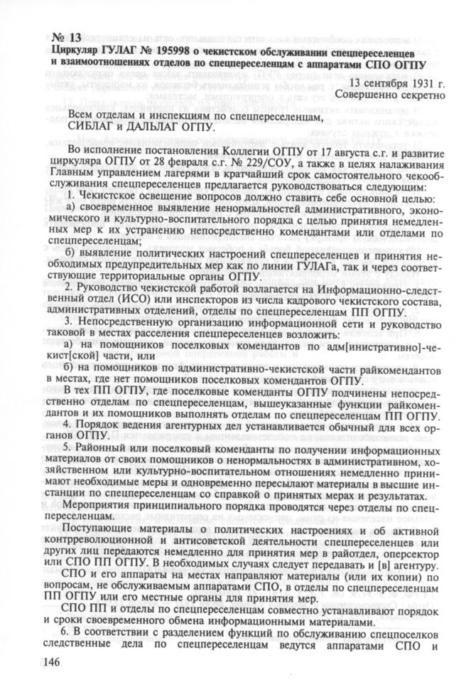 Циркуляр ГУЛАГ № 195998 о чекистском обслуживании спецпереселенцев и взаимоотношениях отделов по спецпереселенцам с аппаратами СПО ОГПУ. 13 сентября 1931 г.