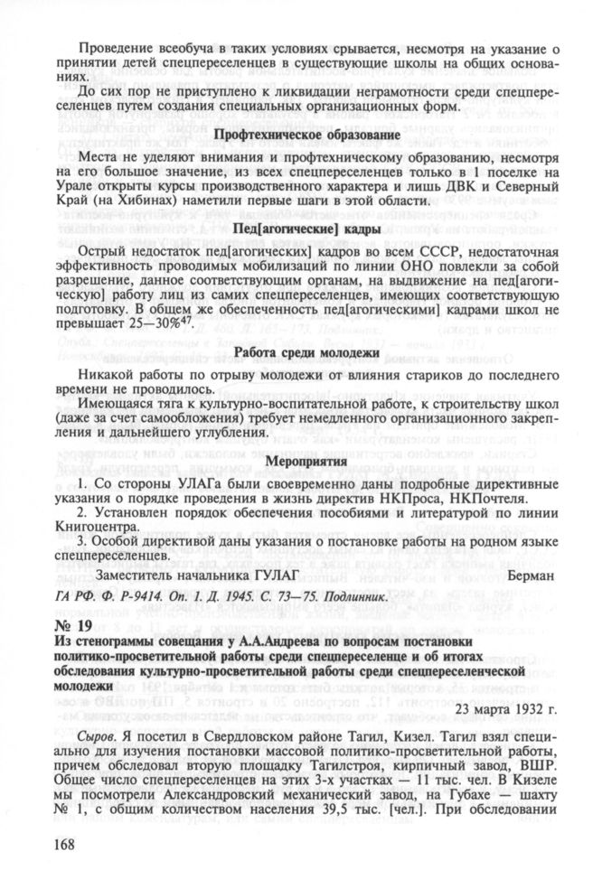 Из стенограммы совещания у А.А.Андреева по вопросам постановки политико-просветительной работы среди спецпереселенце и об итогах обследования культурно-просветительной работы среди спецпереселенческой молодежи. 23 марта 1932 г. // ГА РФ. Ф. P-9414. Оп. 1. Д. 1949. Л. 23-50, 52—55. Копия.