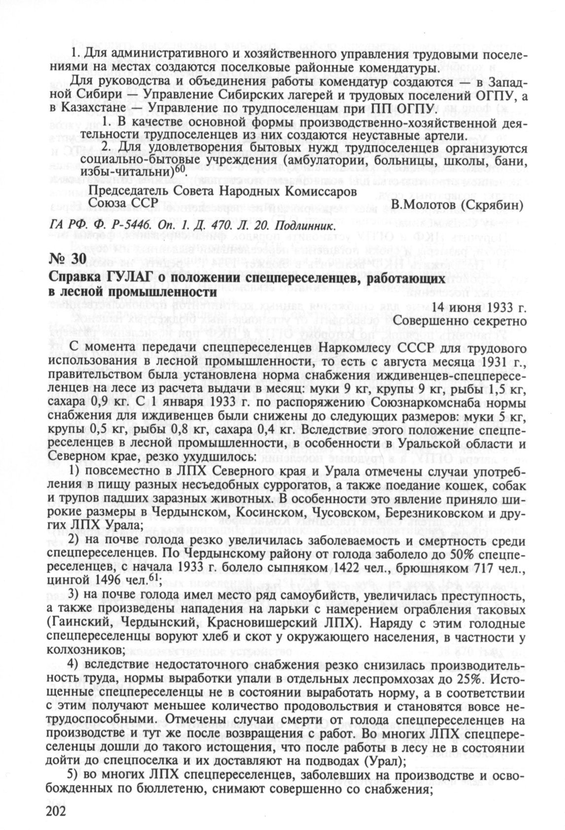 Справка ГУЛАГ о положении спецпереселенцев, работающих в лесной про...