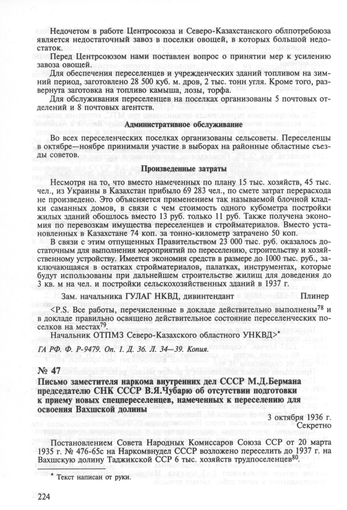 Письмо заместителя наркома внутренних дел СССР М.Д.Бермана председателю СНК СССР В.Я.Чубарю об отсутствии подготовки к приему новых спецпереселенцев, намеченных к переселению для освоения Вахшской долины. 3 октября 1936 г. // ГА РФ. Ф. P-9479. Оп. 1. Д. 34. Л. 71-72. Подлинник.