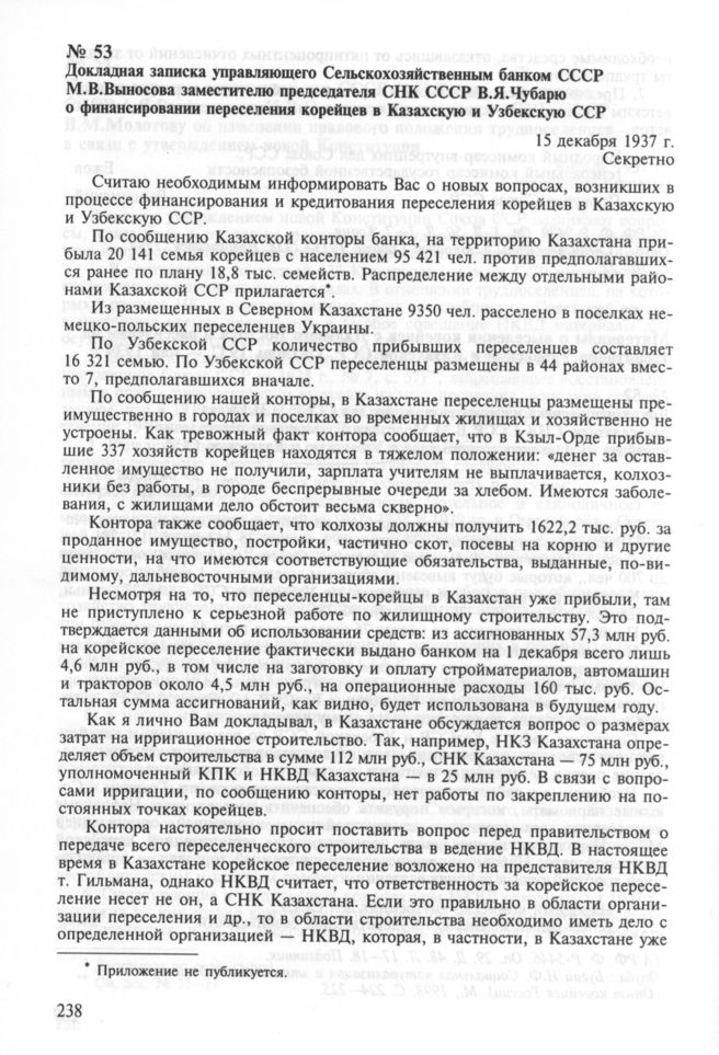 Докладная записка управляющего Сельскохозяйственным банком СССР М.В.Выносова заместителю председателя СНК СССР В.Я.Чубарю о финансировании переселения корейцев в Казахскую и Узбекскую ССР. 15 декабря 1937 г. // ГА РФ. Ф. P-5446. Оп. 29. Д. 48. Л. 38—40. Подлинник. Опубл.: Бугай Н.Ф. Социальная натурализация и этническая мобилизация (Опыт корейцев России). М., 1998. С. 239—240 .