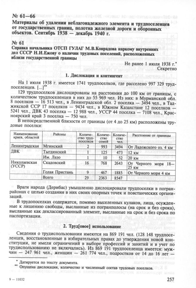 Справка начальника ОТСП ГУЛАГ М.В.Конрадова наркому внутренних дел СССР Н. И. Ежову о наличии трудовых поселений, расположенных вблизи государственной границы. Не ранее 1 июля 1938 г. // ГА РФ. Ф. P-9479. Оп. 1. Д. 48. Л. 9-13. Копия.