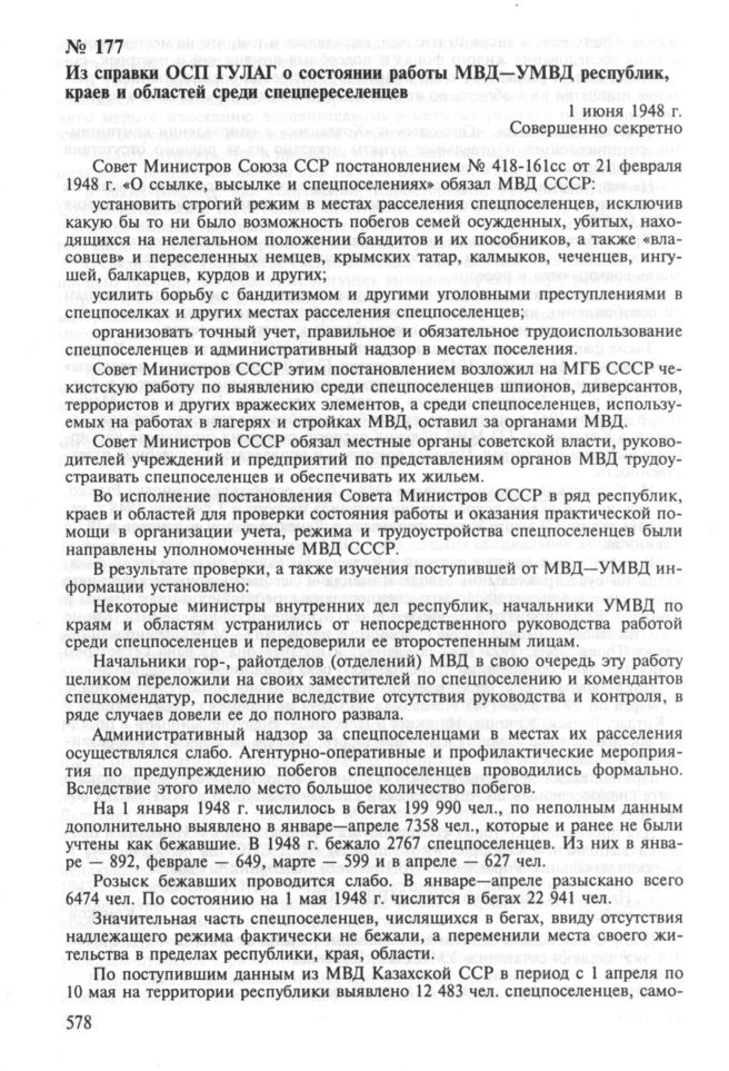 Из справки ОСП ГУЛАГ о состоянии работы МВД—УМВД республик, краев и областей среди спецпереселенцев. 1 июня 1948 г.