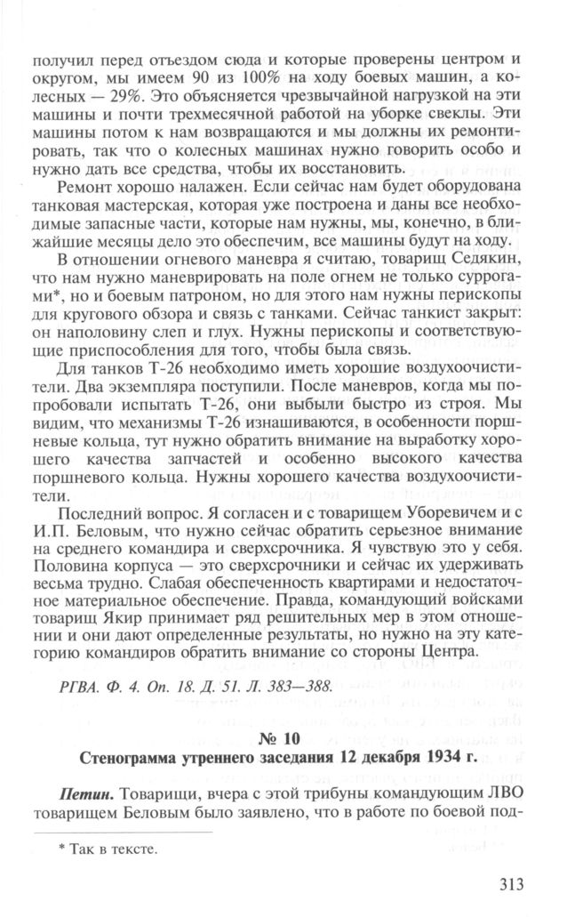 Доклады и выступления участников заседания Военного совета при народном комиссаре обороны СССР по вопросу об итогах боевой подготовки РККА за 1934 г. и о задачах на 1935 г. 10—12 декабря 1934 г. Стенограмма утреннего заседания 12 декабря 1934 г. Петин Н.Н. // РГВА. Ф. 4. Оп. 18. Д. 51. Л. 389-394.