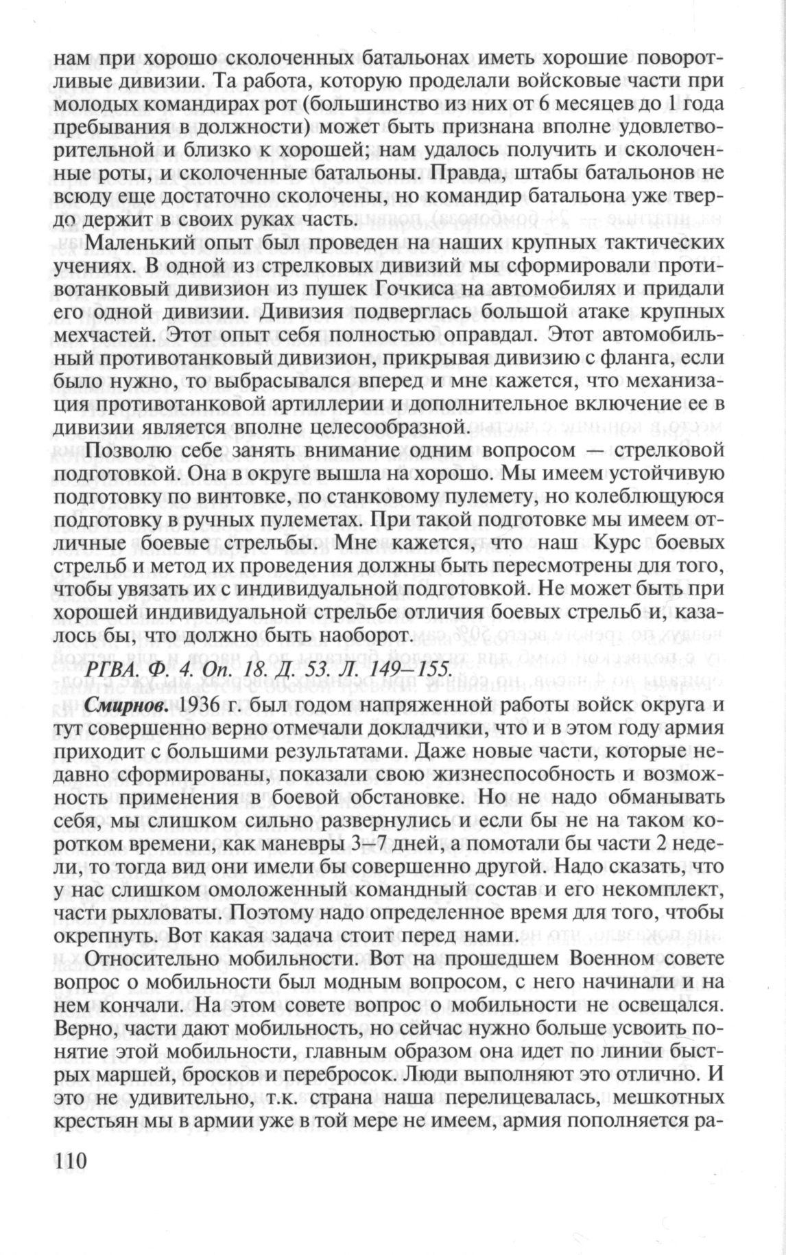 Доклады и выступления участников заседания Военного совета при НКО СССР об итогах боевой подготовки РККА за 1936 г. и задачах на 1937 г. 13—19 октября 1936 г. Утреннее заседание 14 октября 1936 г. Смирнов П.А. // РГВА. Ф. 4. Оп. 18. Д. 53. Л. 156-159.