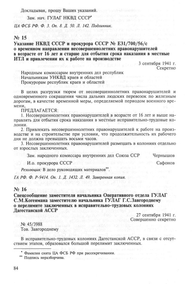 Спецсообщение заместителя начальника Оперативного отдела ГУЛАГ С. М. Когенмана заместителю начальника ГУЛАГ Г. С. Завгороднему о перелимите заключенных в исправительно-трудовых колониях Дагестанской АССР. 27 сентября 1941 г. // ГА РФ. Ф. P-9414. Оп. 1. Д . 39. Л. 52—53. Подлинник. Бланк Оперативного отдела ГУЛАГ.
