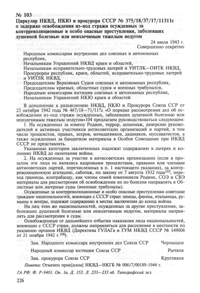 Циркуляр НКВД, НКЮ и прокурора СССР № 375/18/37/17/11311с о задержке освобождения из-под стражи осужденных за контрреволюционные и особо опасные преступления, заболевших душевной болезнью или неизлечимым тяжелым недугом. 24 июля 1943 г. // ГА РФ. Ф. P-9401. Оп. 1а. Д. 153. Л. 233—233 об. Типографский экз.