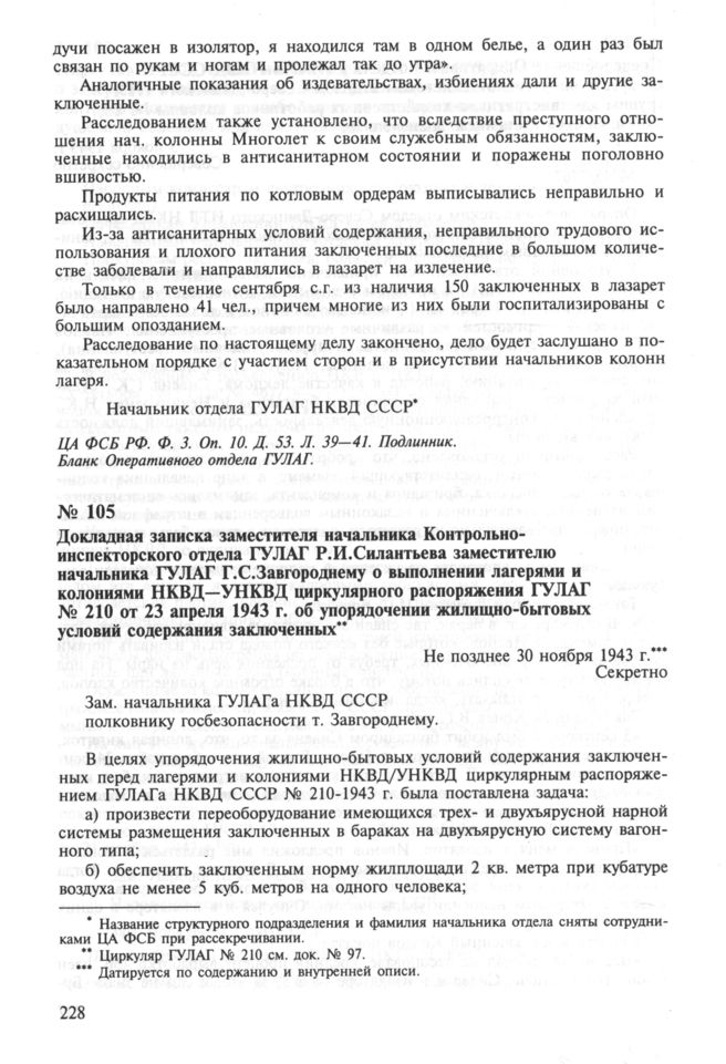 Докладная записка заместителя начальника Контрольно-инспекторского отдела ГУЛАГ Р. И. Силантьева заместителю начальника ГУЛАГ Г. С. Завгороднему о выполнении лагерями и колониями НКВД—УНКВД циркулярного распоряжения ГУЛАГ № 210 от 23 апреля 1943 г. об упорядочении жилищно-бытовых условий содержания заключенных. Не позднее 30 ноября 1943 г. // ГА РФ. Ф. P-9414. Оп. 1. Д. 325. Л. 1—2 об. Копия.