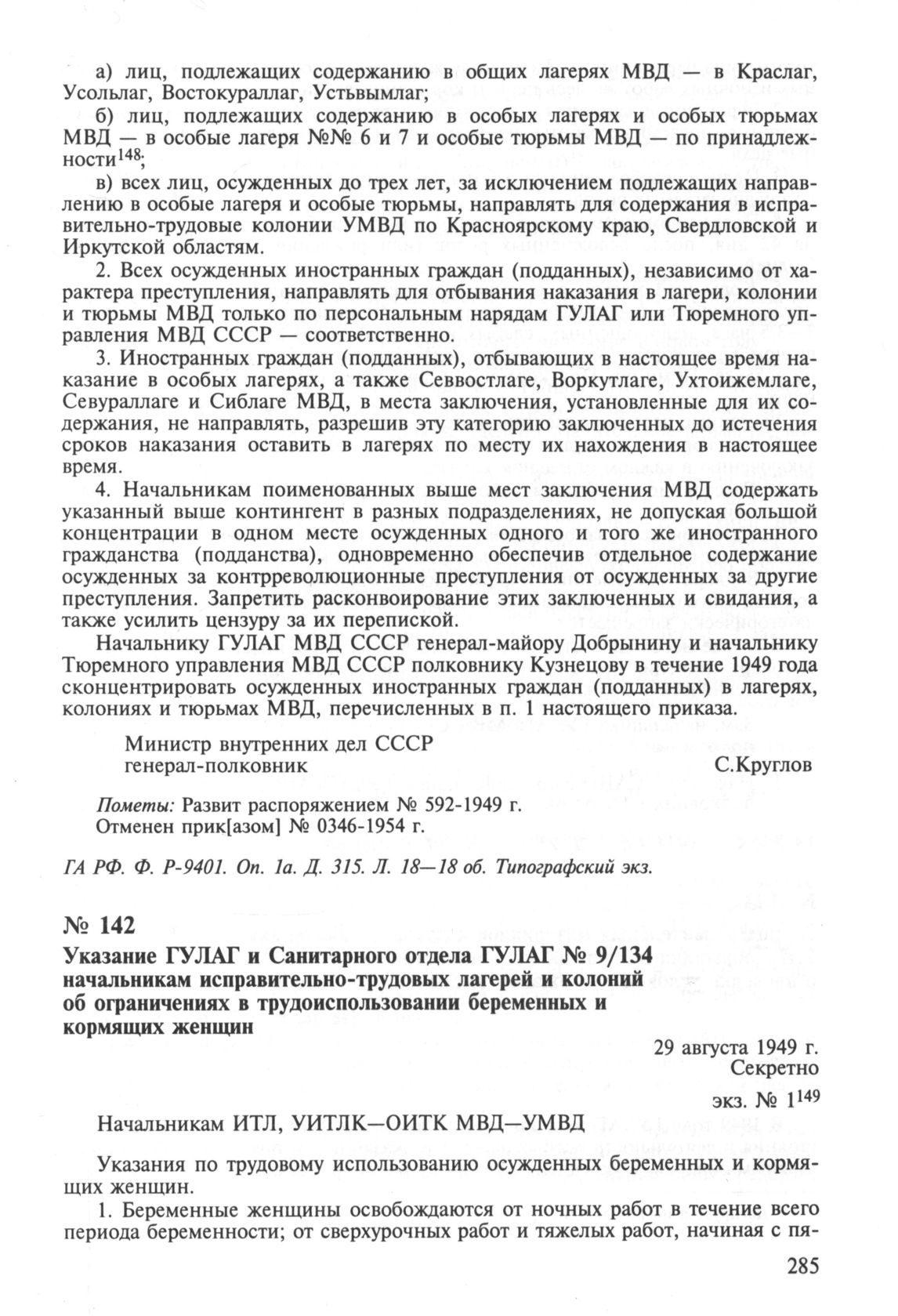 Указание ГУЛАГ и Санитарного отдела ГУЛАГ № 9/134 начальникам исправительно-трудовых лагерей и колоний об ограничениях в трудоиспользовании беременных и кормящих женщин. 29 августа 1949 г. // ГА РФ. Ф. P-9414. Оп. 1. Д. 97. Л. 260—261. Подлинник.