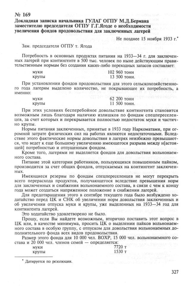 Докладная записка начальника ГУЛАГ ОГПУ М. Д. Бермана заместителю председателя ОГПУ Г. Г. Ягоде о необходимости увеличения фондов продовольствия для заключенных лагерей. Не позднее 15 ноября 1933 г.