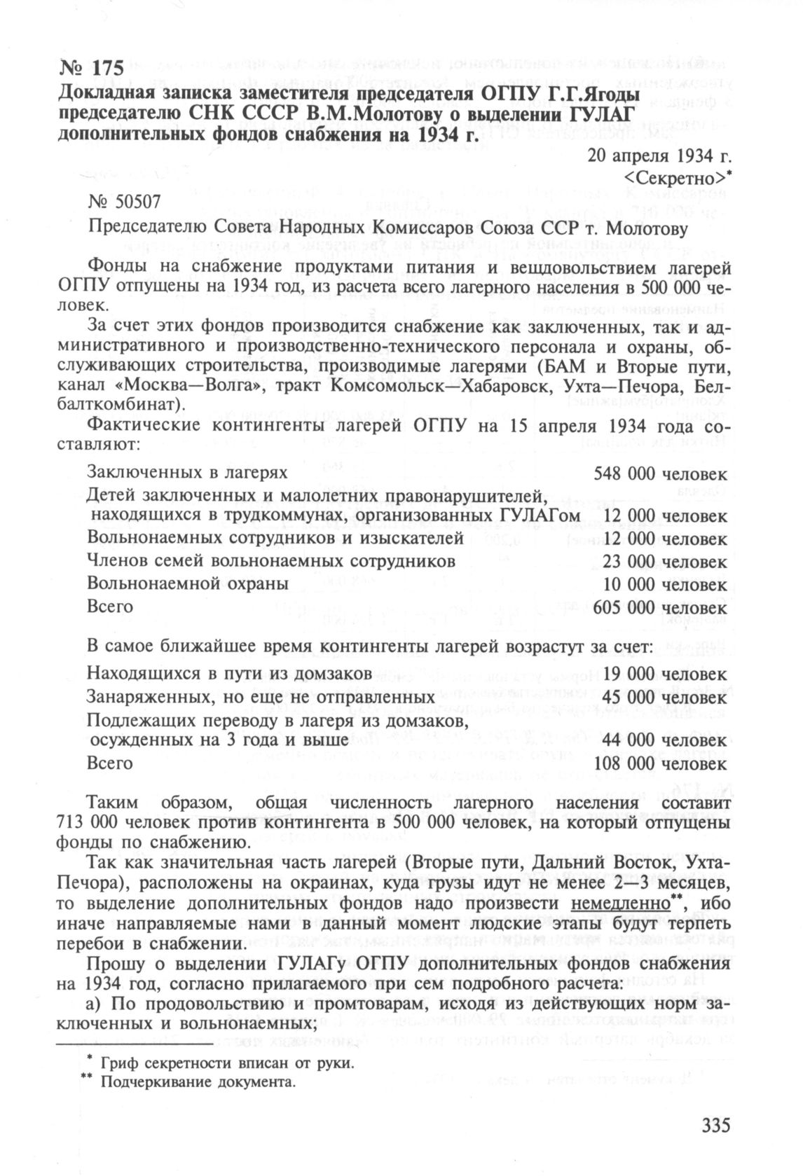 Докладная записка заместителя председателя ОГПУ Г. Г. Ягоды председателю СНК СССР В. М. Молотову о выделении ГУЛАГ дополнительных фондов снабжения на 1934 г. 20 апреля 1934 г.