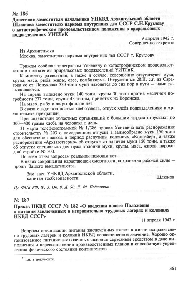 Приказ НКВД СССР № 182 «О введении нового Положения о питании заключенных в исправительно-трудовых лагерях и колониях НКВД СССР». 11 апреля 1942 г. // ГА РФ. Ф. P-9401. Оп. 1а. Д. 121. Л. 45—54 об. Типографский экз.
