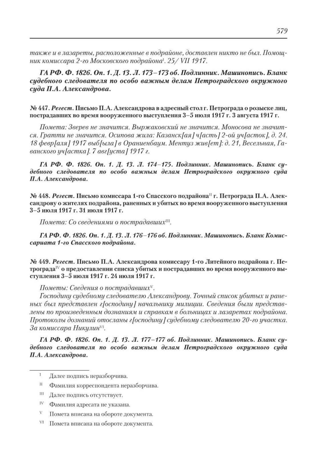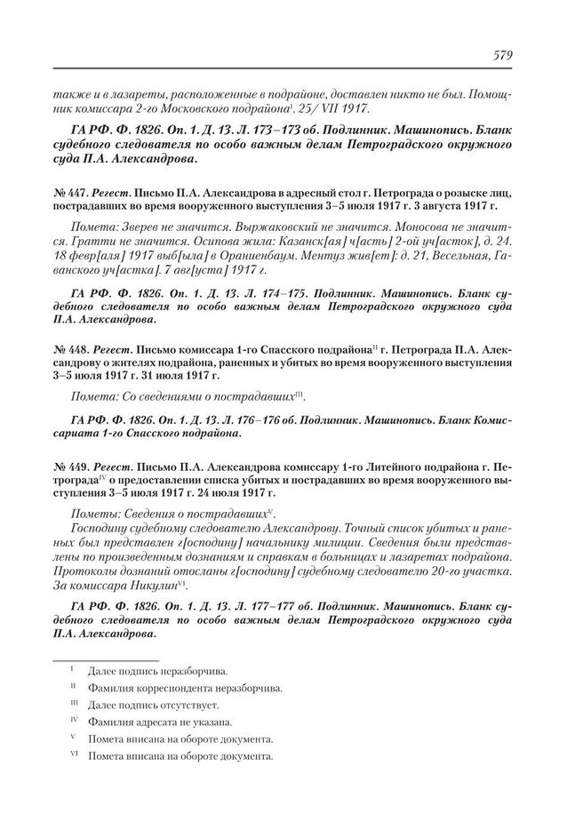 Регест. Письмо П.А. Александрова комиссару 1-го Литейного подрайона г. Петрограда о предоставлении списка убитых и пострадавших во время вооруженного выступления 3–5 июля 1917 г. 24 июля 1917 г. // ГА РФ. Ф. 1826. Оп. 1. Д. 13. Л. 177–177 об. Подлинник. Машинопись. Бланк судебного следователя по особо важным делам Петроградского окружного суда П.А. Александрова.