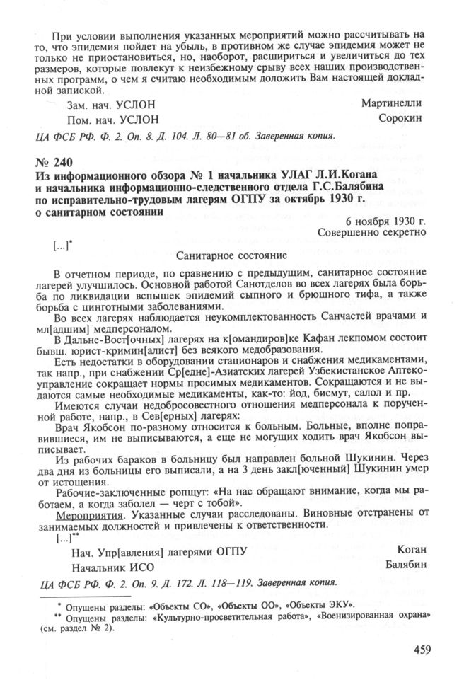 Из информационного обзора № 1 начальника УЛАГ Л. И. Когана и начальника информационно-следственного отдела Г. С. Балябина по исправительно-трудовым лагерям ОГПУ за октябрь 1930 г. о санитарном состоянии. 6 ноября 1930 г. // ЦА ФСБ РФ. Ф. 2. Оп. 9. Д. 172. Л. 118—119. Заверенная копия.