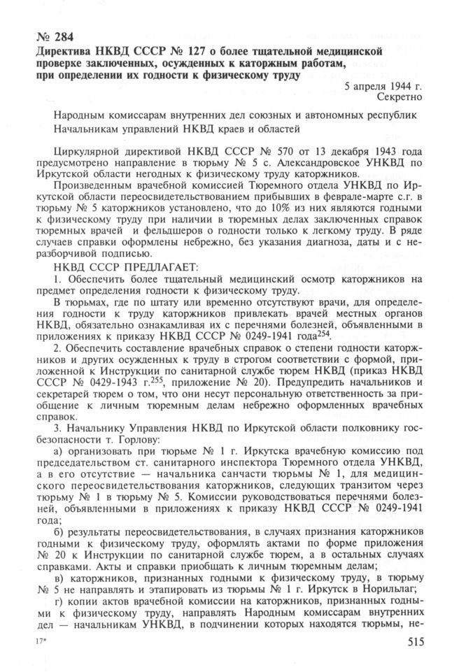 Директива НКВД СССР № 127 о более тщательной медицинской проверке заключенных, осужденных к каторжным работам, при определении их годности к физическому труду. 5 апреля 1944 г.