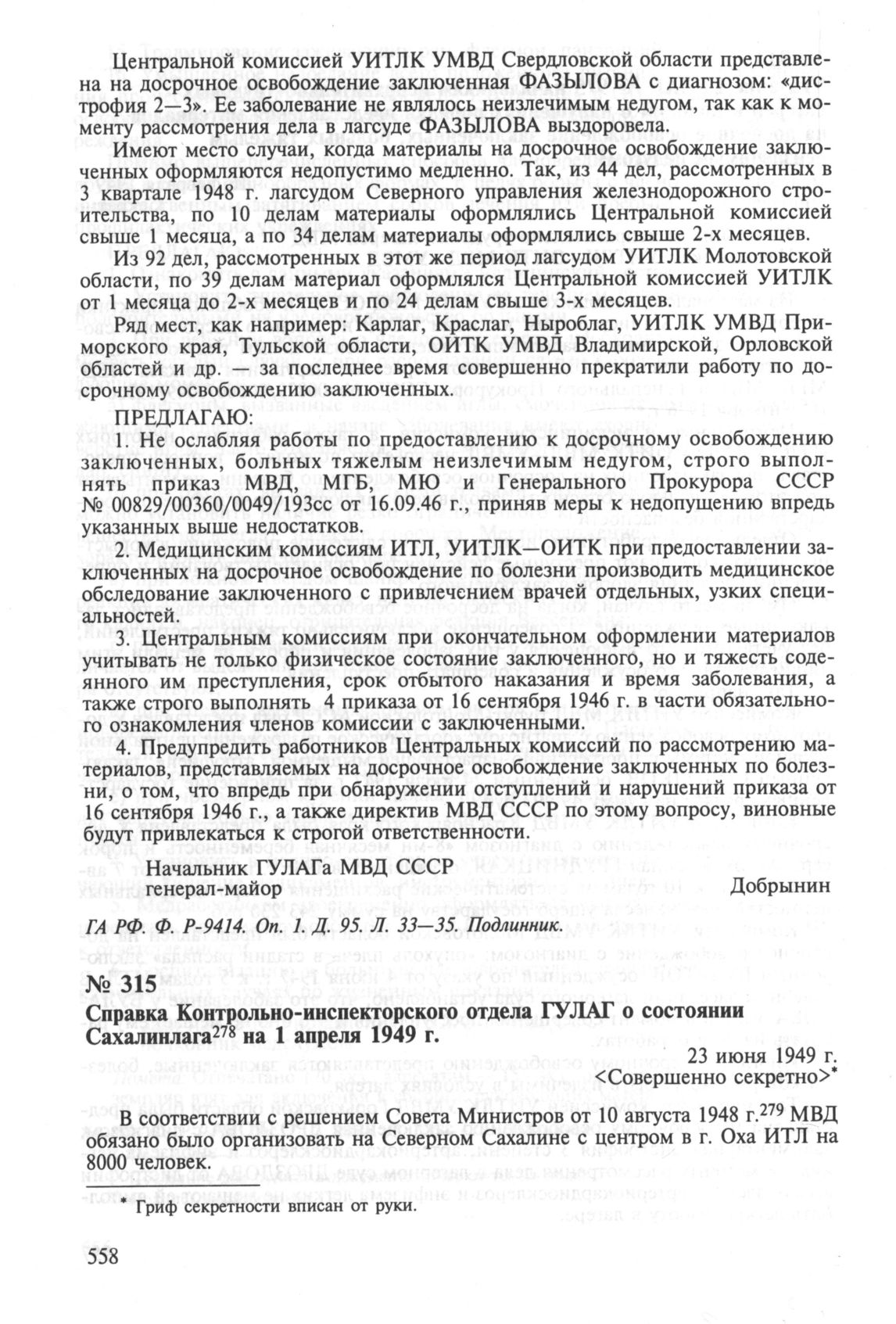Справка Контрольно-инспекторского отдела ГУЛАГ о состоянии Сахалинлага на 1 апреля 1949 г. 23 июня 1949 г.
