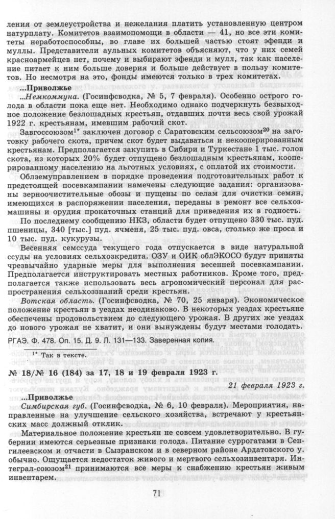 Из земсводки информотдела ГПУ № 16 (184) за 17, 18 и 19 февраля 1923 г. 21 февраля 1923 г. // РГАЭ. Ф. 478. Оп. 15. Д. 8. Л. 15. Заверенная копия.