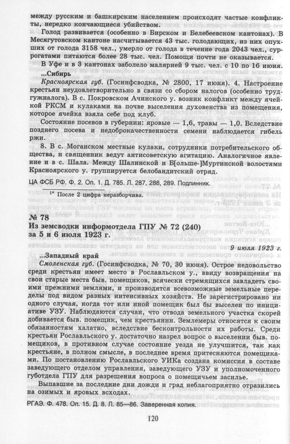 Из земсводки информотдела ГПУ № 72 (240) за 5 и 6 июля 1923 г. 9 июля 1923 г. // РГАЭ. Ф. 478. Оп. 15. Д. 8. Л. 85—86. Заверенная копия.