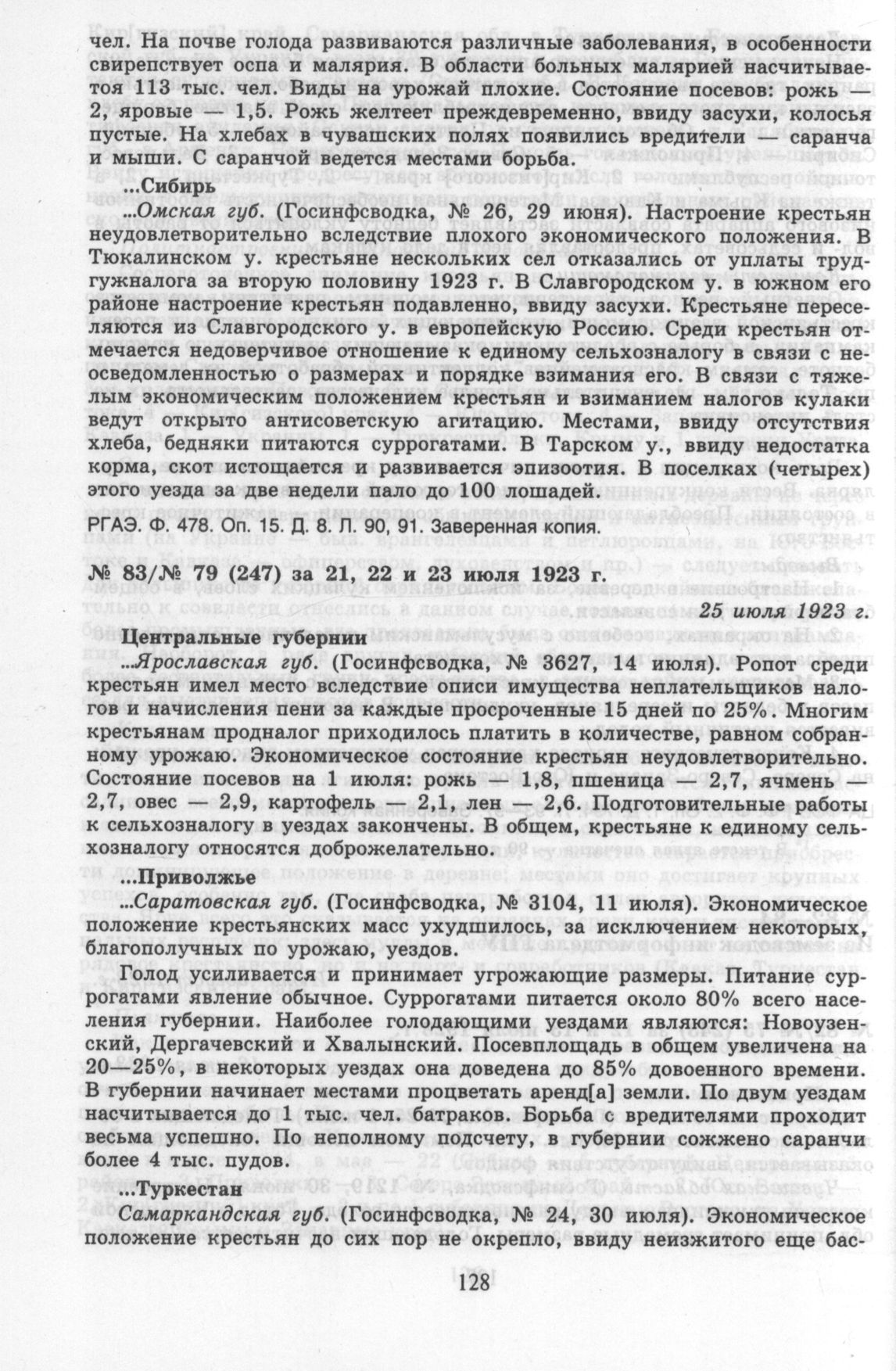Из земсводки информотдела ГПУ № 79 (247) за 21, 22 и 23 июля 1923 г. 25 июля 1923 г. // РГАЭ. Ф. 478. Оп. 15. Д. 8. Л. 157—160. Заверенная копия.