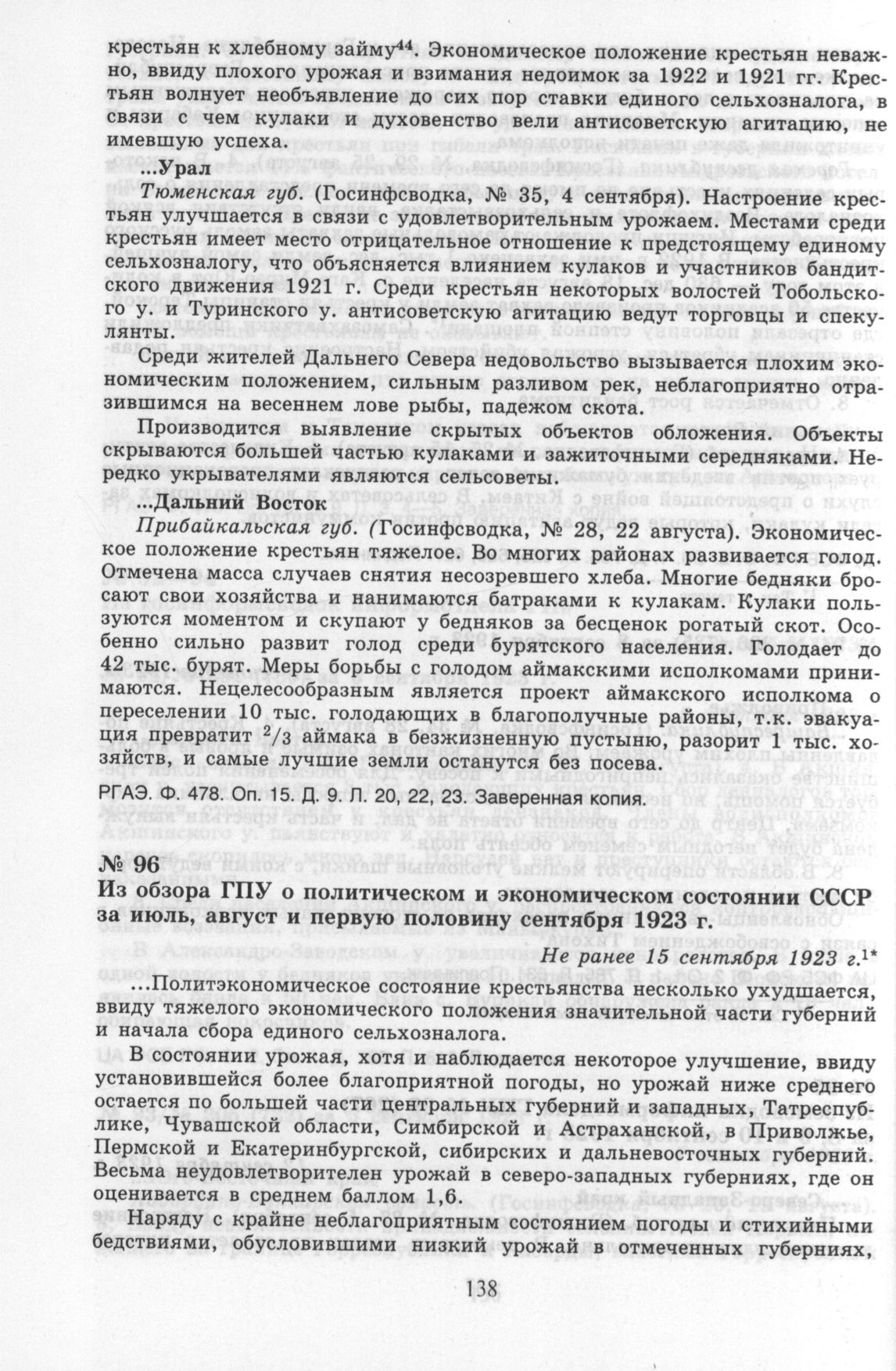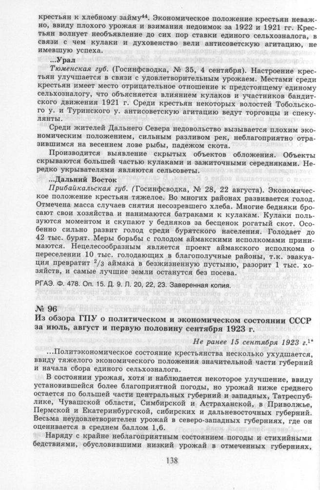 Из обзора ГПУ о политическом и экономическом состоянии СССР за июль, август и первую половину сентября 1923 г. Не ранее 15 сентября 1923 г. // ЦА ФСБ. Ф. 2. Оп. 1. Д. 794. Л. 140—142. Заверенная копия.