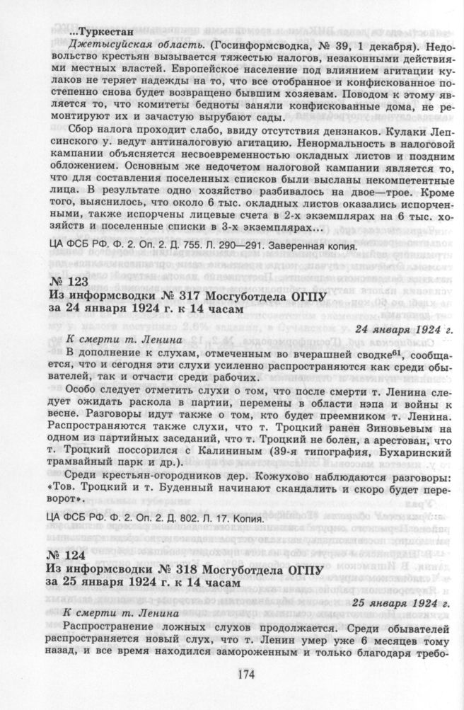 Из информсводки № 317 Мосгуботдела ОГПУ за 24 января 1924 г. к 14 часам. 24 января 1924 г. // ЦА ФСБ РФ. Ф. 2. Оп. 2. Д. 802. Л. 17. Копия.