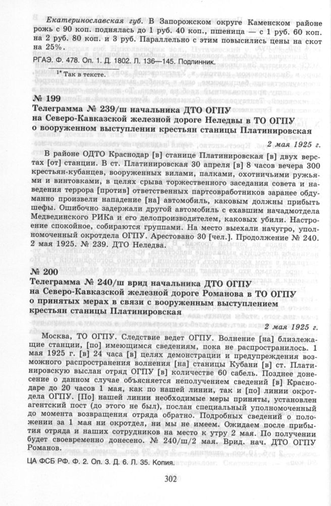 Телеграмма № 240/ш врид начальника ДТО ОГПУ на Северо-Кавказской железной дороге Романова в ТО ОГПУ о принятых мерах в связи с вооруженным выступлением крестьян станицы Платинировская. 2 мая 1925 г. // ЦА ФСБ РФ. ф. 2. Оп. 3. Д. 6. Л. 35. Копия.
