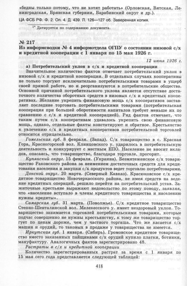 Из информсводки № 4 информотдела ОГПУ о состоянии низовой с/х и кредитной кооперации с 1 января по 15 мая 1926 г. 12 июня 1926 г. // РГАЭ. Ф. 478. Оп. 1. Д. 1969. Л. 130, 148, 151, 152—153. Подлинник.