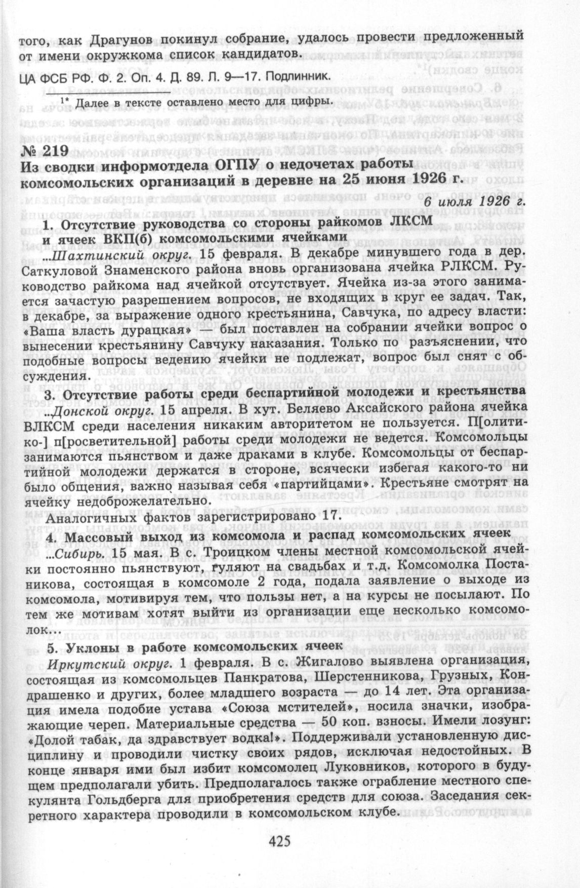 Из сводки информотдела ОГПУ о недочетах работы комсомольских организаций в деревне на 25 июня 1926 г. 6 июля 1926 г. // ЦА ФСБ РФ. Ф. 2. Оп. 4. Д. 79. Л. 2—8. Подлинник.