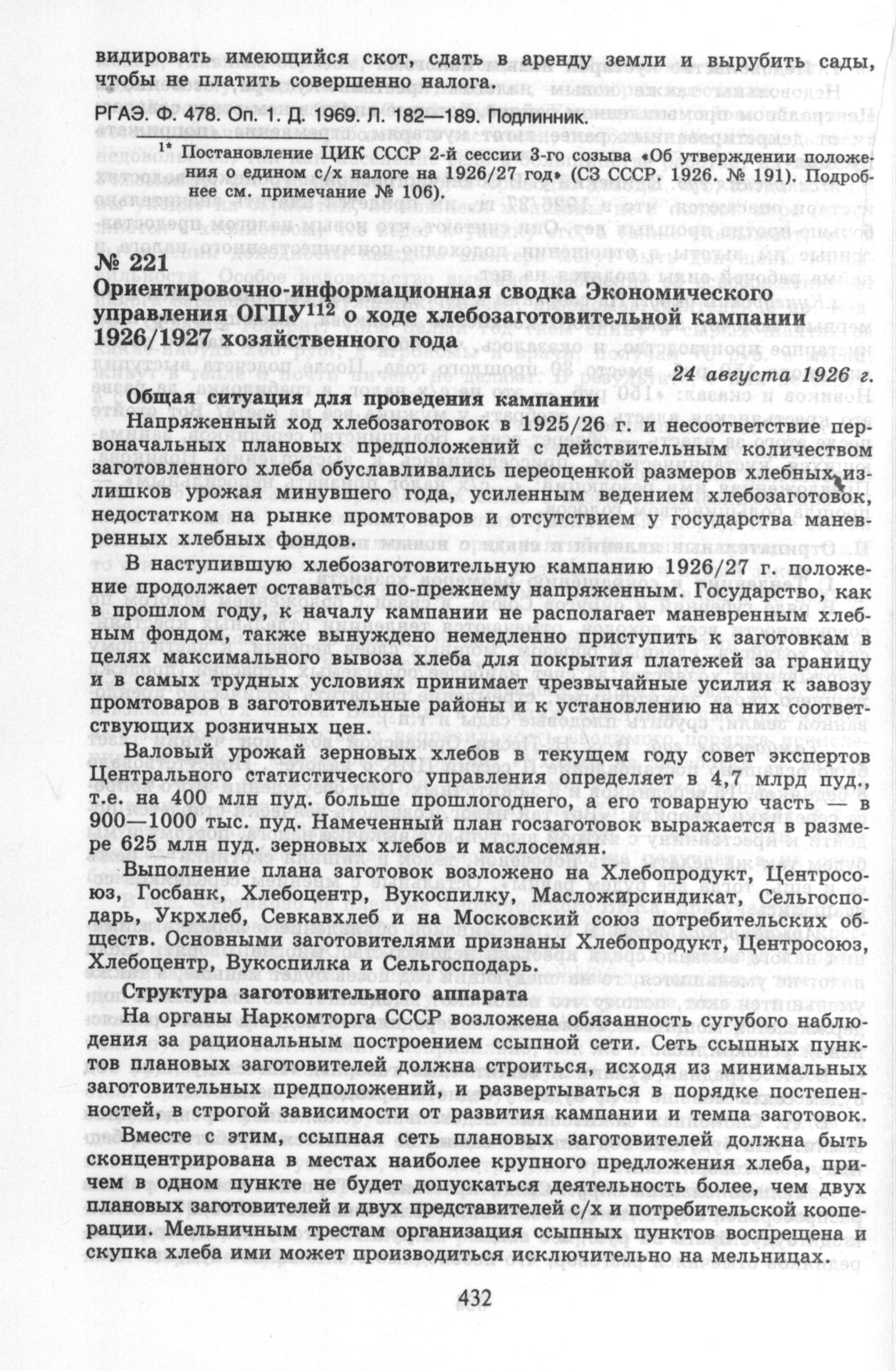 Ориентировочно-информационная сводка Экономического управления ОГПУ о ходе хлебозаготовительной кампании 1926/1927 хозяйственного года. 24 августа 1926 г. // ЦА ФСБ РФ. Ф. 66. Оп. 1. Д. 164. Л. 200—206. Подлинник.