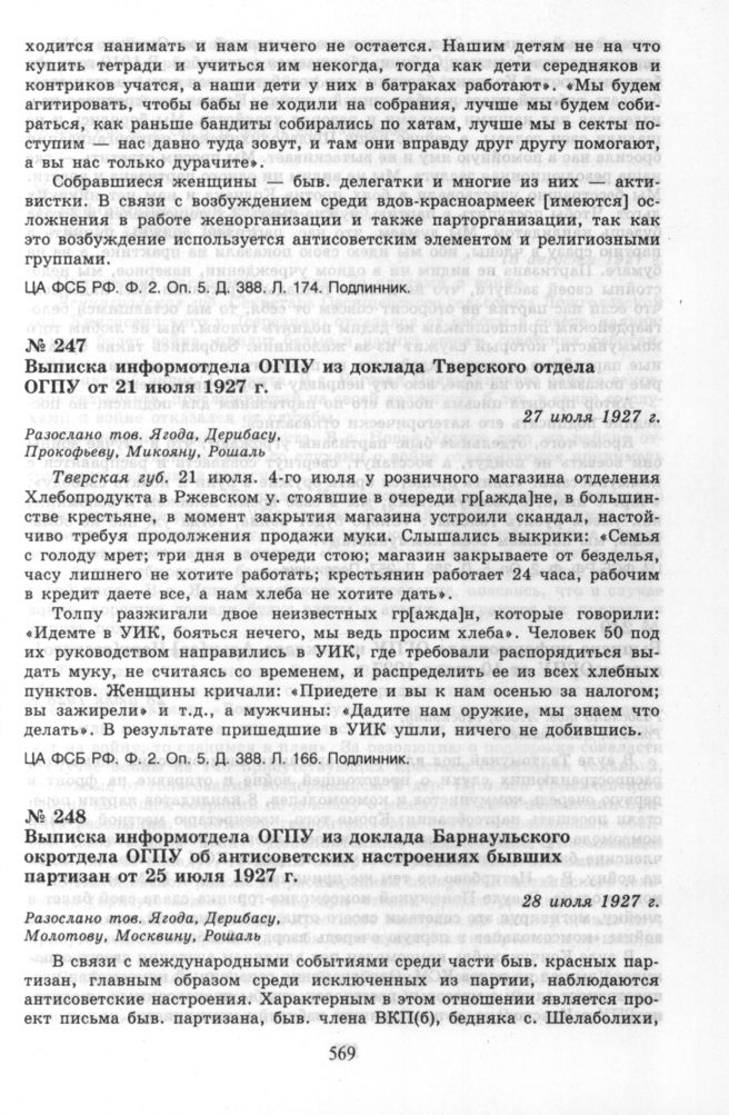 Выписка информотдела ОГПУ из доклада Тверского отдела ОГПУ от 21 июля 1927 г. 27 июля 1927 г. // ЦА ФСБ РФ. Ф. 2. Оп. 5. Д. 388. Л. 166. Подлинник.