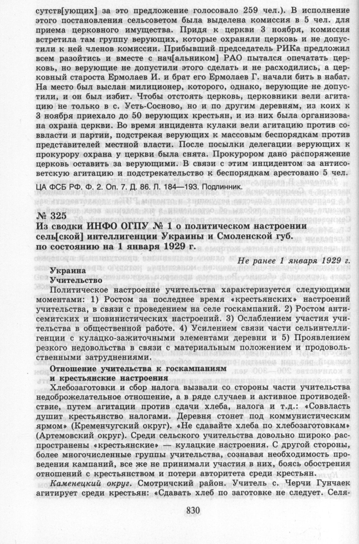 Из сводки ИНФО ОГПУ № 1 о политическом настроении сель[ской] интеллигенции Украины и Смоленской губ. по состоянию на 1 января 1929 г. Не ранее 1 января 1929 г. // ЦА ФСБ РФ. Ф. 2. Оп. 7. Д. 523. Л. 10—23. Заверенная копия.