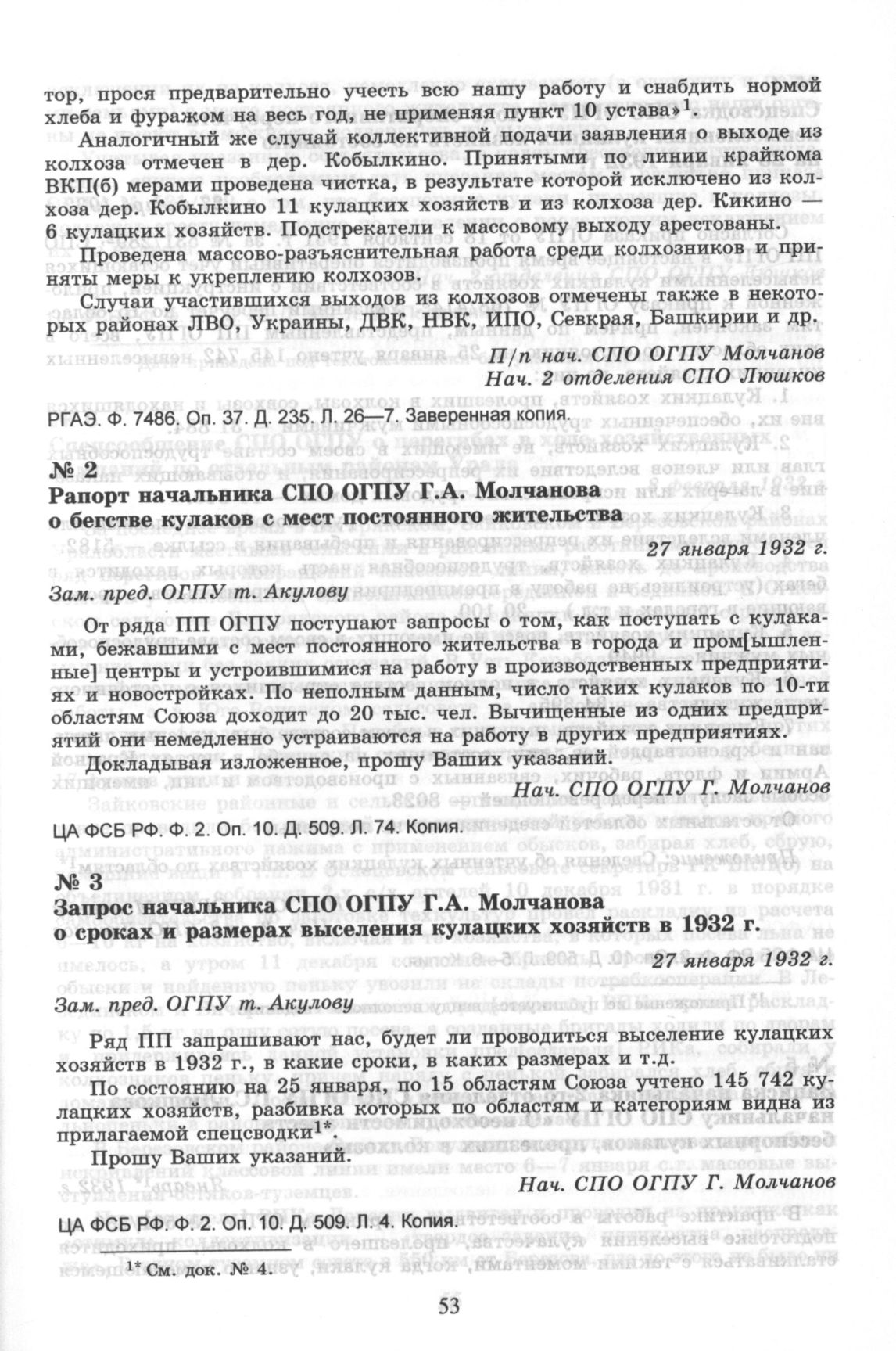 Запрос начальника СПО ОГПУ Г.А. Молчанова о сроках и размерах выселения кулацких хозяйств в 1932 г. 27 января 1932 г. // ЦА ФСБ РФ. Ф. 2. Оп. 10. Д. 509. Л. 4. Копия.