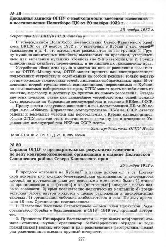 Докладная записка ОГПУ о необходимости внесения изменений в постановление Политбюро ЦК от 20 ноября 1932 г. 23 ноября 1932 г. // ЦА ФСБ РФ. Ф. 2. Оп. 10. Д. 21. Л. 385. Копия.